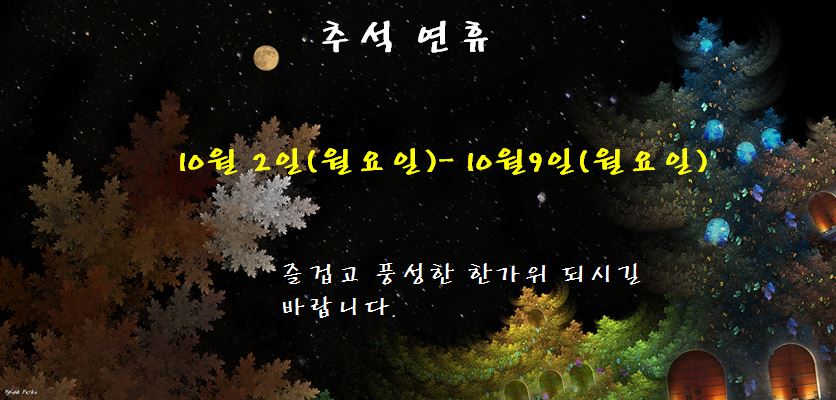 공지추석휴가 / 10월 2일(월요일) ~10월 9일 (월요일) 등록일 : 2017.09.26조회수 : 6806 이전글 여름휴가 공지 / 7월 31일(월요일) ~8월 4일 (금요일) 2017.07.26 다음글 [언론/보도] 삼성물산과 Global Partnership Agreement 체결 2017.10.27 목록보기