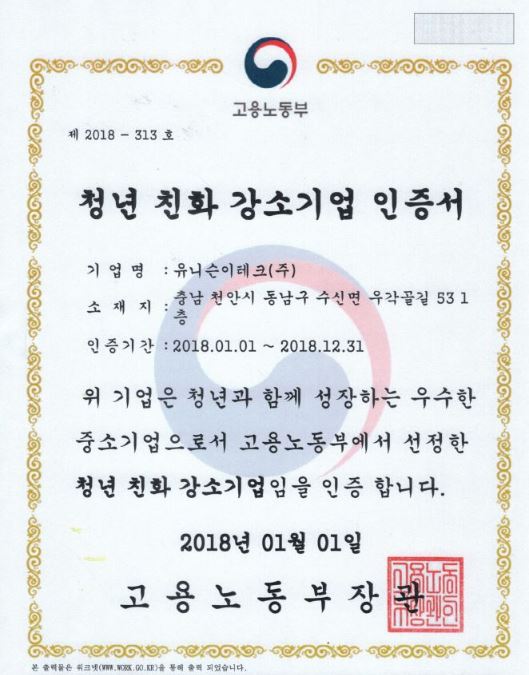 공지2018년" 청년 친화 강소기업" 선정 등록일 : 2018.05.11조회수 : 6788 유니슨이테크가 고용노동부에서 선정한 "강소기업"으로 선정되었습니다. 강소기업으로 선정되기 위해서는 임금체불이 없고, 고용 유지율이 높으며, 산업재해율이 낮은 곳 등 다양한 요건을 충족해야합니다.그중 "청년 친화 강소기업"은 임금, 일- 생활균형, 고용안정이 우수하여 청년들이 근무하기 좋은 곳을 말합니다. 이전글 [언론/보도] 러시아 로사톰 (ROSATOM) 원전용 부품 공급자격 획득 2018.02.02 다음글 나이스 (NICE) 평가정보 면진·제진 기술평가 우수기업 인증 2018.05.24 목록보기