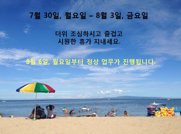 공지여름휴가 공지 / 7월 30일(월요일) ~8월 3일 (금요일) 등록일 : 2018.07.17조회수 : 6666 이전글 [언론/보도] NICE평가정보 면진ㆍ제진 분야 최우수 인증 2018.05.25 다음글 추석휴가 / 9월 22일(토요일) ~9월 26일 (수요일) 2018.09.12 목록보기