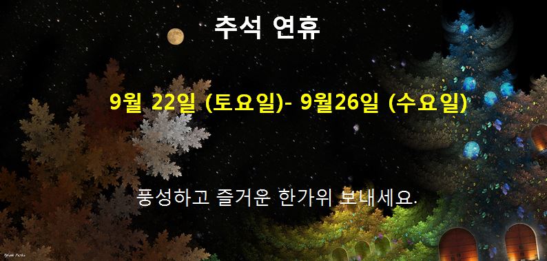 공지추석휴가 / 9월 22일(토요일) ~9월 26일 (수요일) 등록일 : 2018.09.12조회수 : 6573 이전글 여름휴가 공지 / 7월 30일(월요일) ~8월 3일 (금요일) 2018.07.17 다음글 [언론/보도] 유니슨이테크, 산업부 장관상ㆍ국무총리 표창 수상 2018.09.17 목록보기