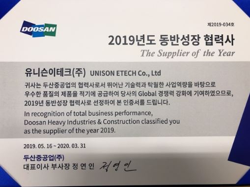 공지2019년 두산 동반성장 협력사 선정 등록일 : 2019.05.20조회수 : 7931 유니슨이테크는 2019년 두산중공업의 동반성장 협력사로 선정되었다. 글로벌 경쟁력을 강화해 두산과 동반성장 해 나갈 수 있는 방안을 적극적으로 기여한 기업에게 수여되는 인증서이다. 이전글 [언론/보도] 유니슨이테크, 에티오피아 前 부수상 방문 2019.04.22 다음글 2019년 '청년 친화 강소기업' 선정 2019.05.27 목록보기