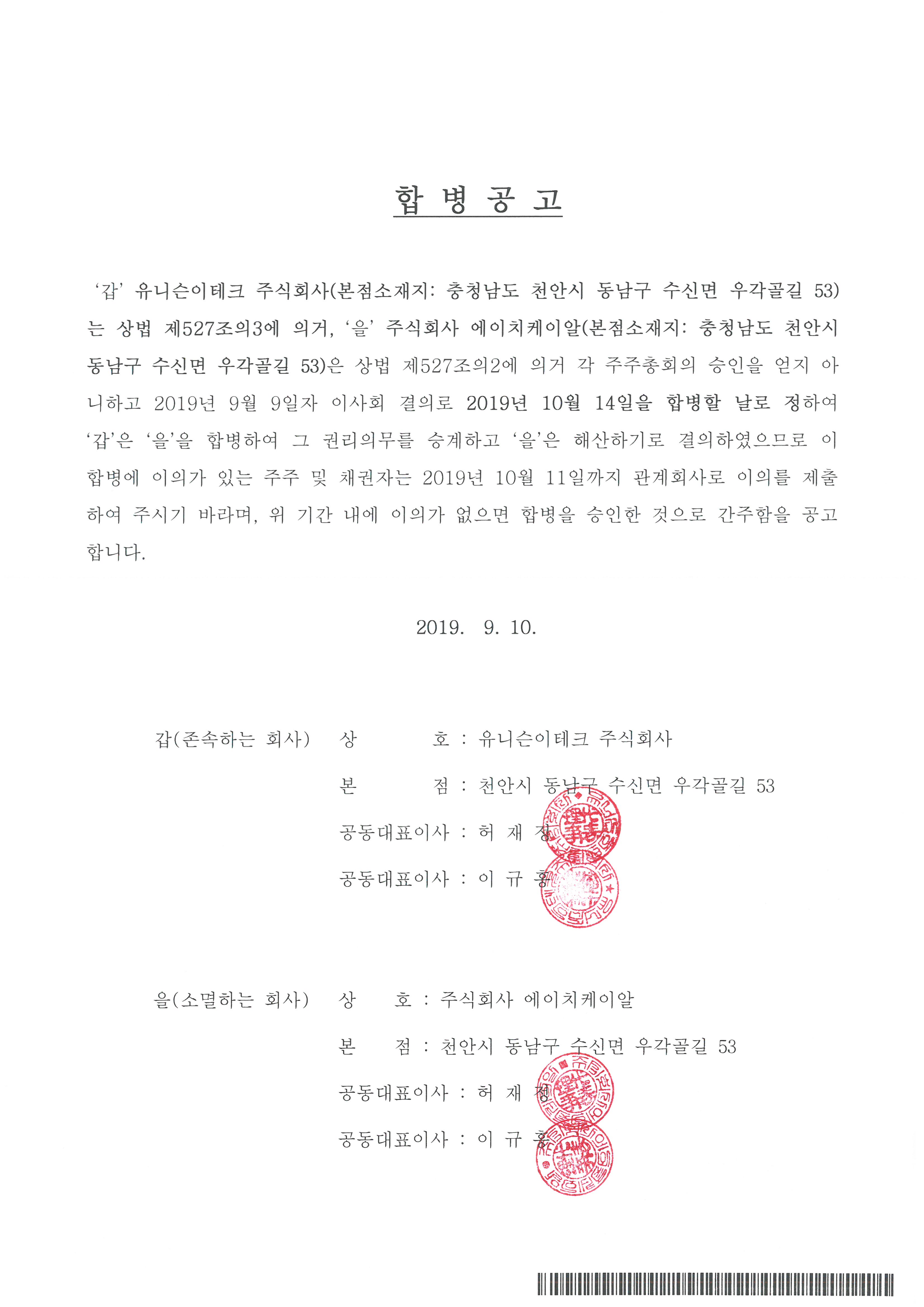 공지합병공고 - 유니슨이테크(주) 등록일 : 2019.09.10조회수 : 6311 이전글 2019년 '청년 친화 강소기업' 선정 2019.05.27 다음글 합병 및 주권 제출 공고 - (주)에이치케이알 2019.09.10 목록보기
