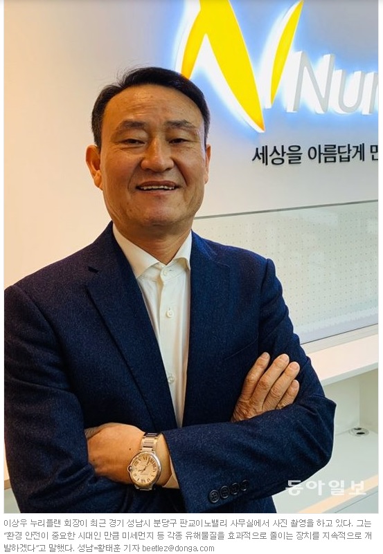 최근 경기 성남시 분당구 판교로 판교이노밸리 사무실에서 만난 이상우 누리플랜그룹 회장(58)은 미세먼지 저감 사업에 뛰어들게 된 계기를 이같이 말했다. 그는 “미세먼지는 현대인의 건강과 안전을 가로막는 요물”이라며 “이제 매연, 미세먼지를 줄이는 환경 개선 사업은 미래의 먹거리”라고 강조했다.
