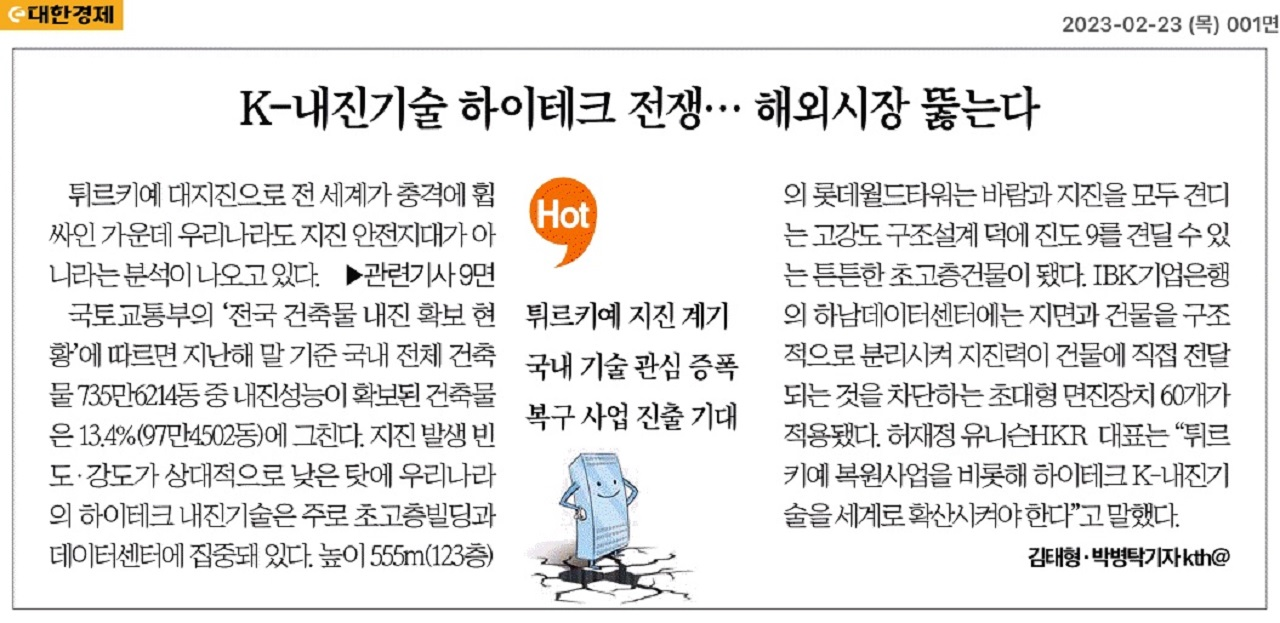 공지[언론/보도] K-내진기술 하이테크전쟁 / 초대형 면진받침 위에 데이터센터 건설 [2023.02.23] 등록일 : 2023.02.23조회수 : 3997 이전글 [언론/보도] UAE와 61억 달러 양해각서 맺었다는 한국 기업들 어딘가 봤더니 [2023.01.17] 2023.01.19 다음글 전자증권 전환 대상 주권 권리자[주주] 보호 및 조치사항 안내 2023.05.18 목록보기